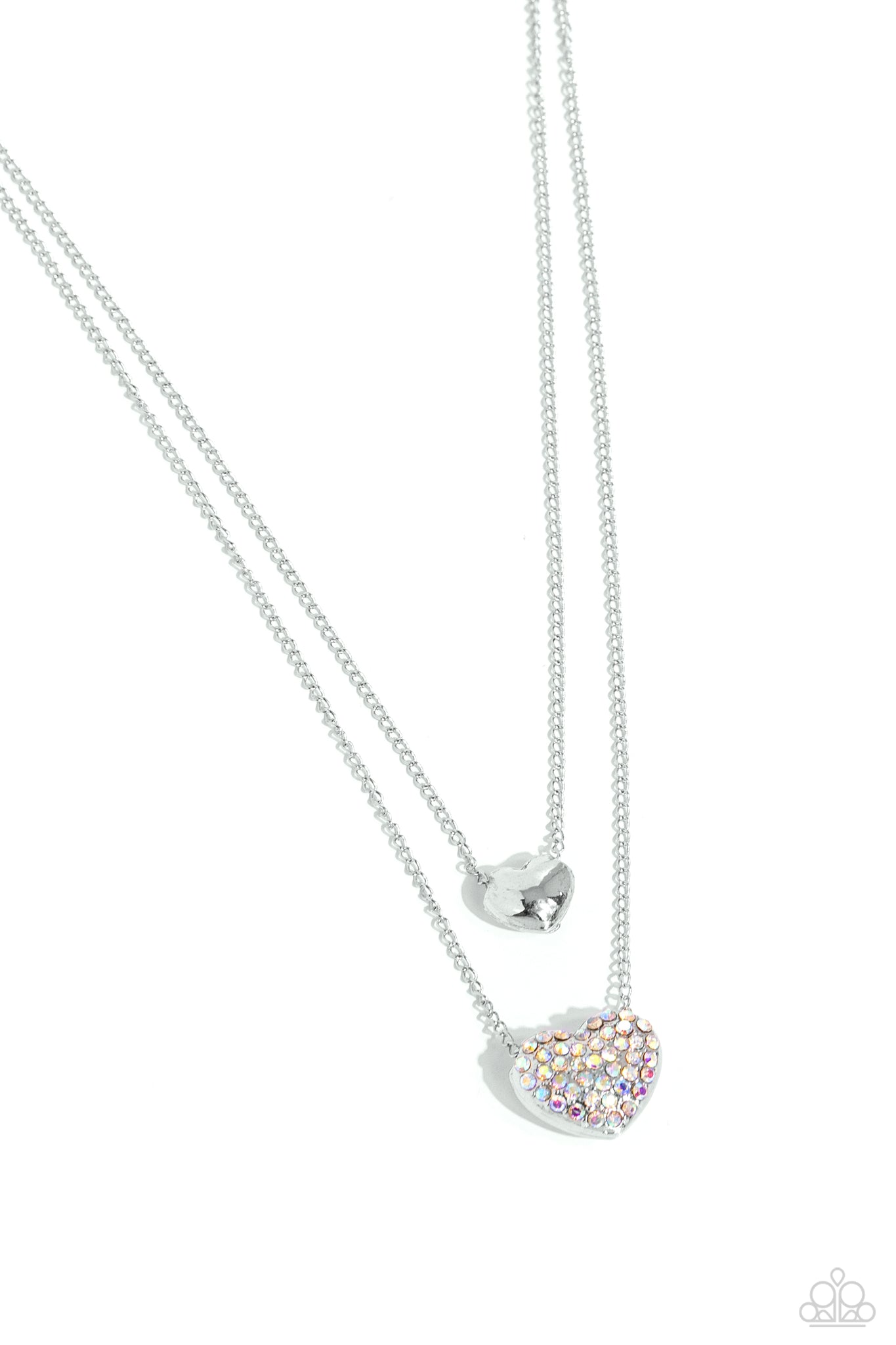 Featuring mismatched finishes, a dainty silver heart, and larger iridescent rhinestone-embellished heart layer down the chest in a romantically, refined fashion. Features an adjustable clasp closure. Due to its prismatic palette, color may vary.