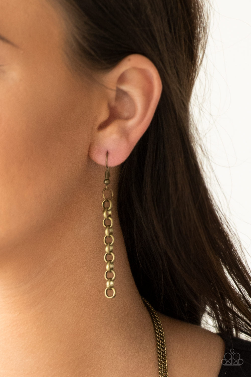 Bold brass chain links give way to layers of mismatched brass chain, creating a dramatic industrial collision. Features an adjustable clasp closure.