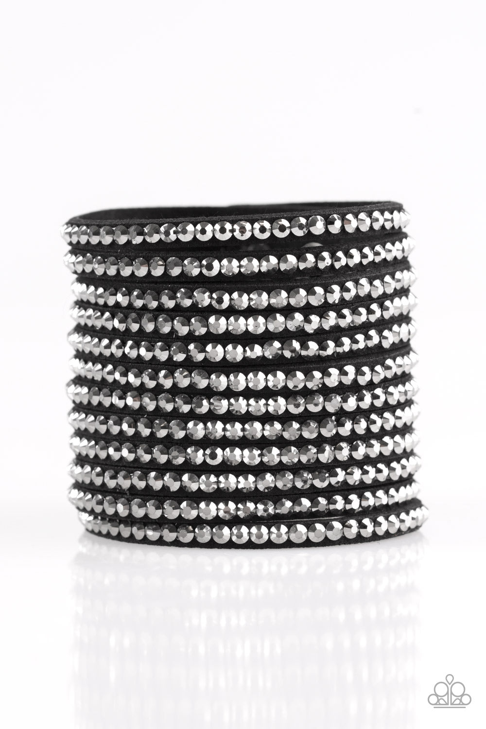 A thick black suede band is spliced into various strands. Glassy hematite rhinestones are sprinkled across the strands, creating blinding shimmer around the wrist for a knockout look. Features an adjustable snap closure.